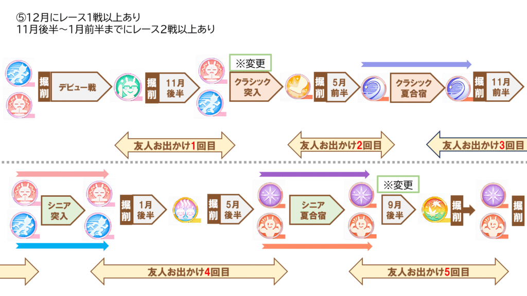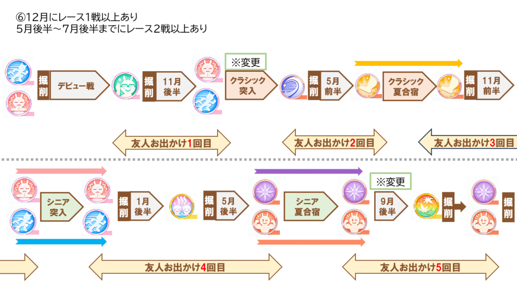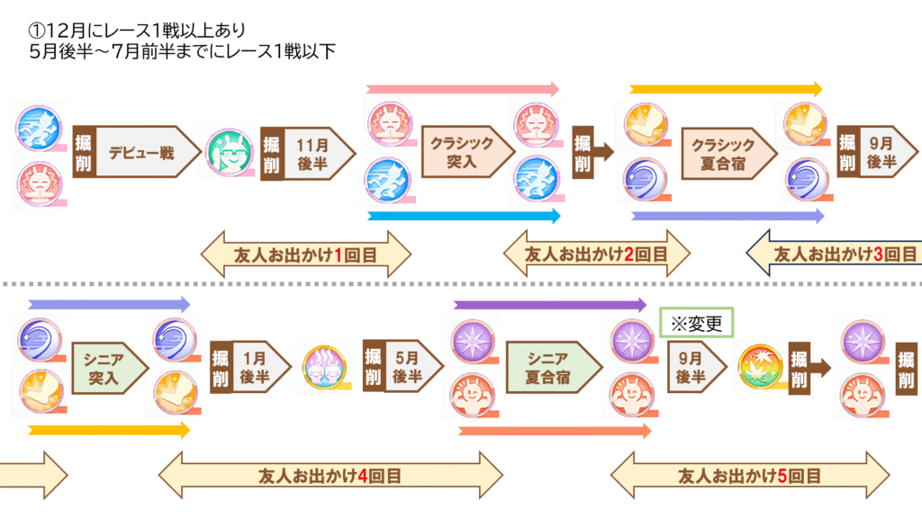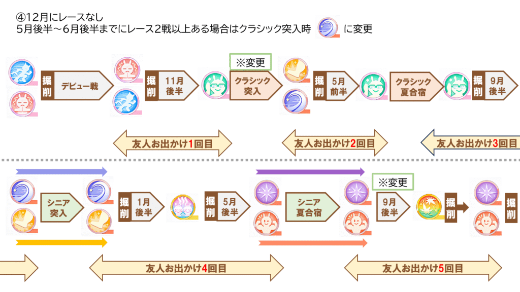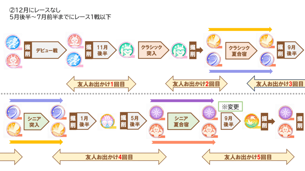この掘削ローテは12月に目標レース1戦以上のとき、または5月後半~7月前半までに目標レース2戦以上ある場合におすすめで、後者に当てはまる場合はクラシック突入時に“天翔の古湯”にしてください