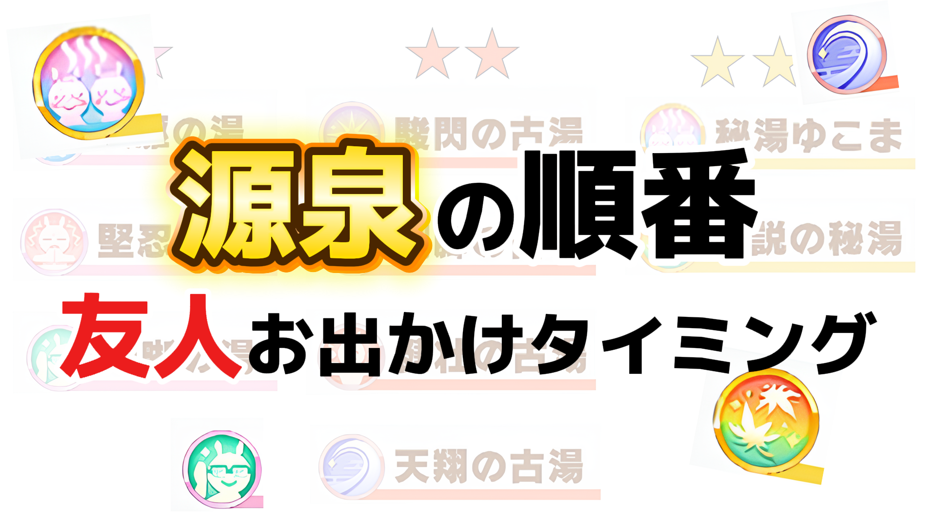 ウマ娘 【ウマ娘】源泉掘削の順番&友人のお出かけタイミング【ゆこま温泉郷】 ウマ娘の新シナリオ、”ごくらく♪ゆこま温泉郷”で大切な源泉掘削の順番と友人のお出かけタイミングを紹介します また注意点として今回紹介していること以外にも様々な立ち回りが存在しておりますので参考程度で捉えていただけると幸いです 源泉一覧 (a... 2025.10.31 ウマ娘ゆこま温泉郷